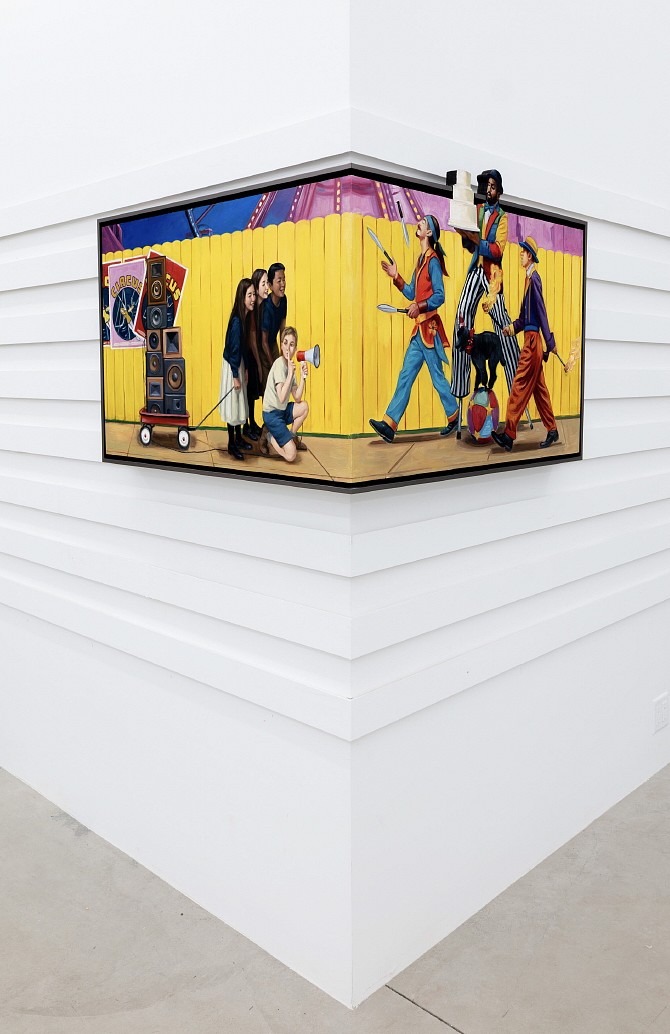 Acrylic, Oil, and Spray Paint on Woodcut & Street Sign, 97 x 99 in.